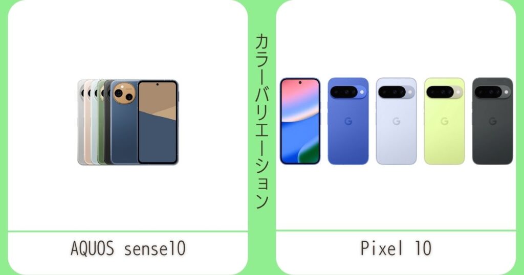 黒と青は共通(※全く同じ色ではない)で、AQUOS sense10には緑とピンク、薄い青、シルバーがあり、Pixel 10には黄緑と白があります。