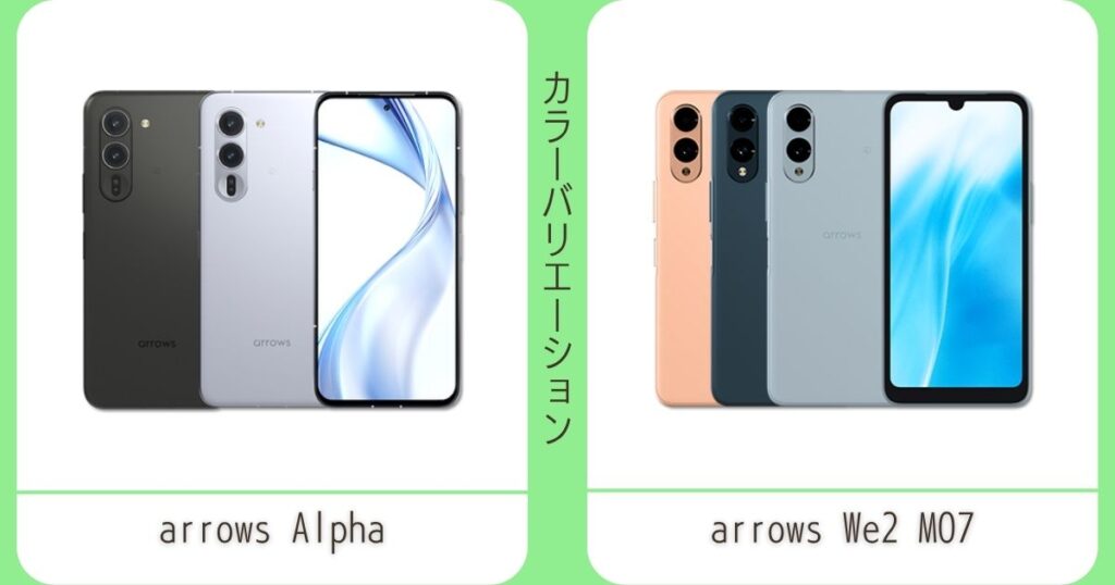 arrows Alphaはホワイト・ブラックの2色展開、arrows We2 M07はライトブルー・ネイビーグリーン・ライトオレンジの3色展開です。