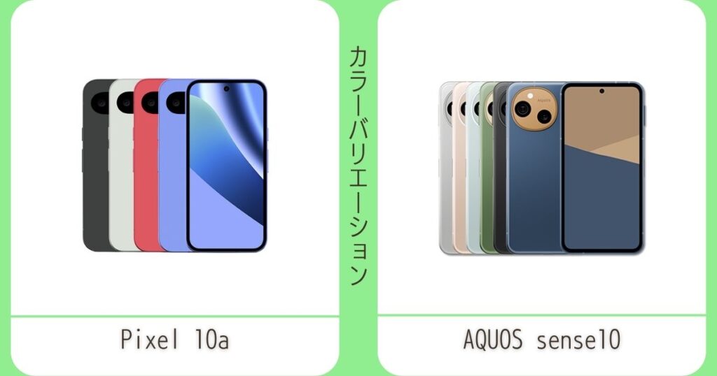 どちらの機種も淡い色が多めですが、AQUOS sense10のほうがより落ち着いた印象のカラーが多くなっています。また、AQUOS sense10は背面カメラが突出していますが、Pixel 10aはフルフラットデザイン。